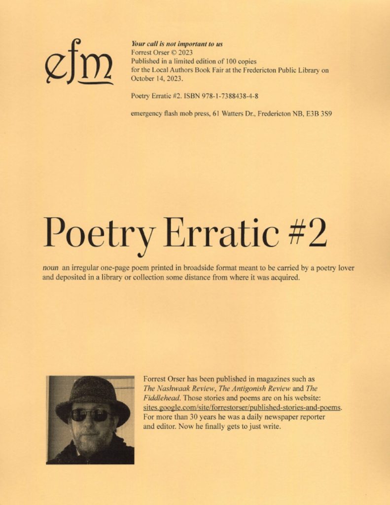 I’ve only lived in two cities and they are both on the St. John River. I grew up in Saint John, NB, and I’ve lived in Fredericton for more than 50 years. For 33 of those years, I was a reporter and an editor with The Daily Gleaner, Fredericton’s newspaper. And, for all those years, what I really wanted to do was write poems and short stories all the time. Now, that’s exactly what I get to do… Continue reading →